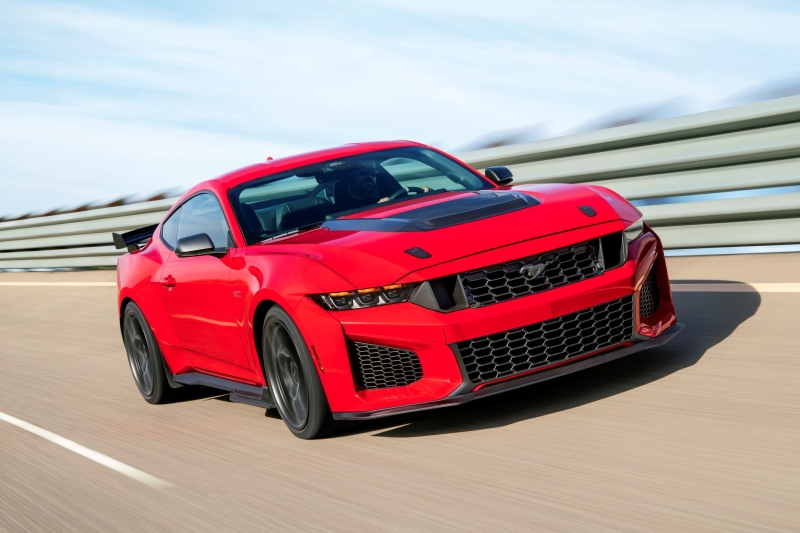 Новым таинственным спорткаром от подразделения Ford Racing оказался не суперкар GT нового поколения, а самый крутой из современных Мустангов с традиционной компоновкой — Dark Horse SC. Буквы SC здесь расшифровываются как supercharged и указывают на мощный 5,2-литровый компрессорный V8 Predator под капотом. Есть и масса других изменений по сравнению с атмосферным Ford Mustang Dark Horse. Подразделение Ford Racing анонсировало полностью новый спорткар в ноябре прошлого года, после чего все принялись гадать, что это будет за машина. Мы, как и многие зарубежные коллеги, накидали несколько вариантов, в том числе новый Ford GT и новый Ford Mustang Shelby GT500, но в итоге сегодня миру был явлен Ford Mustang Dark Horse SC. В пресс-релизе прямо сказано, что он займёт в модельном ряду место между атмосферным Ford Mustang Dark Horse и Ford Mustang GTD. Ford Mustang GTD — это, напомним, самый крутой из существующих заводских Мустангов, у него собственное уникальное шасси, разработанное в партнёрстве с канадской фирмой Multimatic, компоновка типа Transaxle (мотор спереди, а коробка передач отнесена к задним колёсам) и сильно перекроенный по сравнению с другими Мустангами кузов. Короче говоря, Mustang GTD — это почти суперкар, и цена у него почти как у суперкара — от 325 000 долларов. До появления GTD самой крутой версией Мустанга была Shelby GT500, но в нынешнем седьмом поколении Мустанга заводских версий с именем Shelby нет, и, судя по всему, уже не будет — это было понятно ещё в начале прошлого года, когда компания Shelby American представила собственный новый Shelby GT350 на базе Мустанга, а Ford не имеет к этой машине никакого отношения. Что касается топового Shelby GT500, то сегодня стало окончательно ясно, что ему на смену пришёл Mustang Dark Horse SC. Идейно свежеиспечённый Ford Mustang Dark Horse SC ничем не отличается от Shelby GT500 на базе «шестого» Мустанга, но улучшены все ключевые технические параметры, а место змеи на эмблемах заняла тёмная лошадка. Компоновка — такая же, как у всех обычных Мустангов, то есть коробка пристыкована непосредственно к двигателю, а с задними колёсами её соединяет углепластиковый карданный вал. Дифференциал усилен и снабжён собственным радиатором охлаждения. Силовой агрегат у Ford Mustang Dark Horse SC, в сущности, такой же, как у последнего заводского Shelby GT500, то есть 5,2-литровый V8 Predator в паре 7-ступенчатым «роботом» Tremec с двумя сцеплениями, но отдача двигателя пока не раскрыта. Для ориентира скажем, что на последнем Shelby GT500 этот двигатель в стоке выдаёт 771 л.с., на Ford Mustang GTD — 826 л.с. Полагаем, что у Mustang Dark Horse SC мощность будет где-то посередине, то есть на уровне 800 «лошадей». Внешне Ford Mustang Dark Horse SC отличается от младшего атмосферного собрата более агрессивным дизайном бамперов, увеличенными воздуховодами спереди и развитым диффузором сзади. Подвеска перенастроена под возросшую мощность, в «базе» установлены адаптивные амортизаторы MagneRide и более жёсткие пружины, пересмотрены характеристики рулевого управления и геометрия задней подвески, установлены мощные дисковые тормоза Brembo с 6-поршневыми суппортами спереди и 4-поршневыми сзади, колёса обуты в шины Pirelli P Zero R. Уже в первый год производства Ford Mustang Dark Horse SC будет предложен также в хардкорном исполнении Track Pack (синяя машина на фотографиях) с рядом дополнительных улучшений. На корме здесь установлено регулируемое антикрыло, а под ним находится уникальный для версии Track Pack вытянутый спойлер типа «утиный хвостик», повышающий эффектив